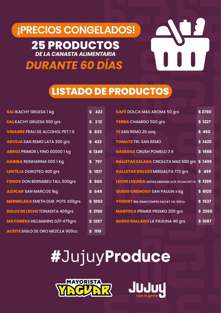 El “Convenio de Cooperación y Asistencia Mutua” entre el Ministerio de Desarrollo Económico y Producción y Supermercados Mayorista Yaguar S.A. tiene como objeto congelar 25 productos de la Canasta Básica por un periodo de 60 días, con el fin de aliviar el gasto que genera el consumo de estos alimentos y de esa manera contribuir a mejora de la economía familiar de los hogares jujeños.